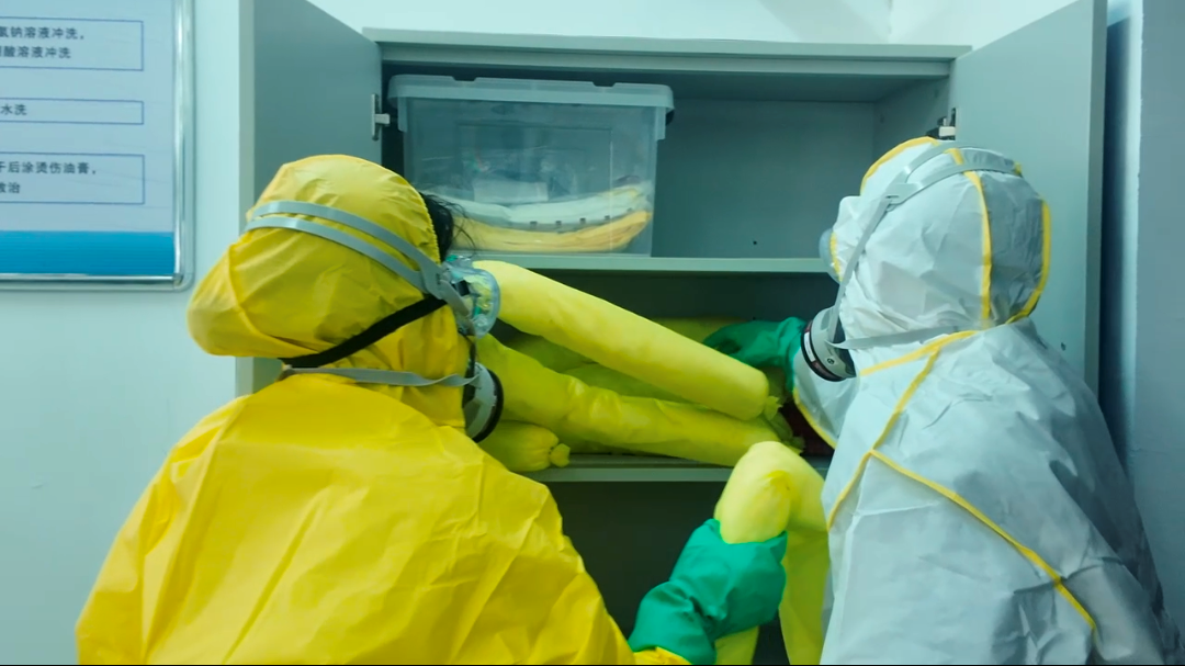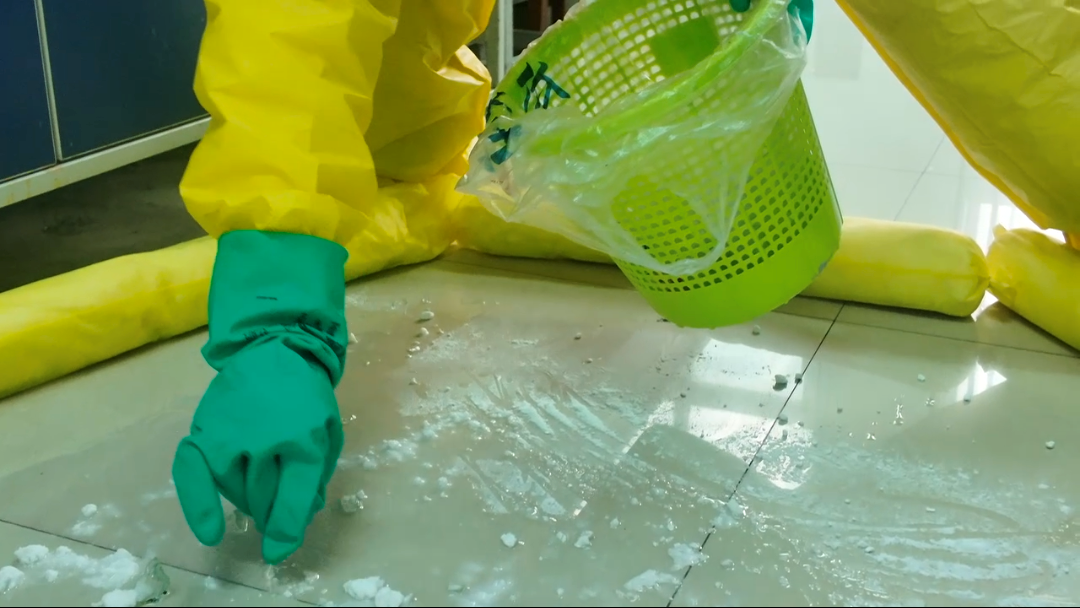 演练于当日下午3点准时开始。首先进行的是危险化学品泄漏应急演练。模拟场景为实验室内浓盐酸发生意外泄漏。事故一经“发现”,现场人员立即按照应急预案程序上报,并迅速启动应急响应。应急处置小组身着专业防护服,携带吸附棉、中和剂等器材迅速抵达现场,划定警戒区域,规范操作,对泄漏物进行快速、有效的控制与清理。整个过程紧张有序,各环节衔接紧密,充分展示了学院对危化品突发事件的规范处置流程和高效应对能力。