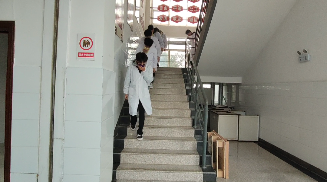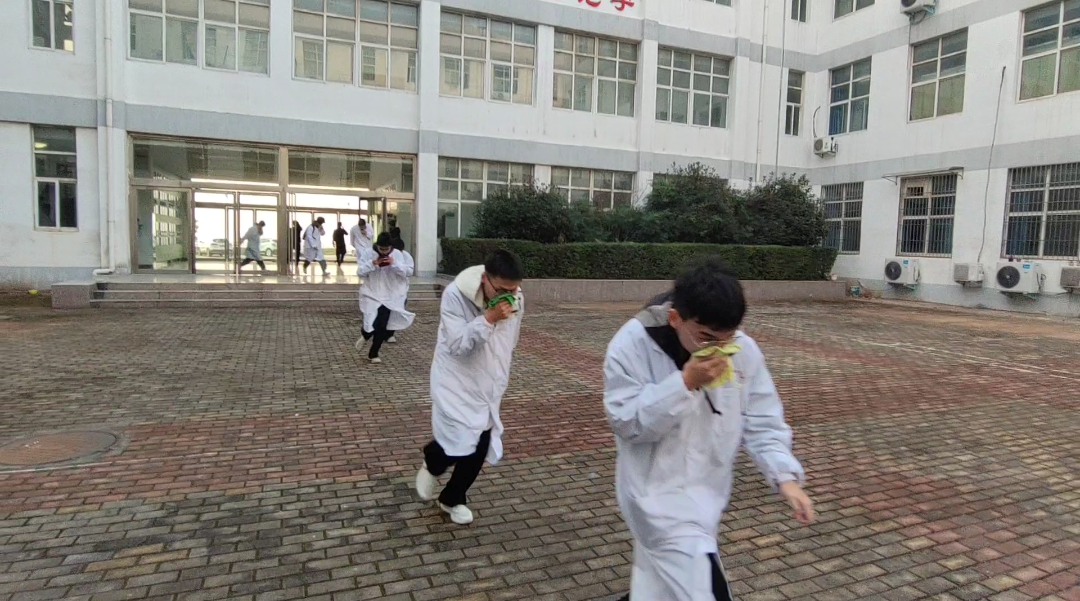紧随其后的是火灾逃生疏散演练。化学楼内模拟响起火灾警报,浓烟弥漫。在实验室老师及安全员的引导下,楼内师生迅速反应,用湿毛巾捂住口鼻,弯腰低姿,沿着预定的紧急疏散路线,快速、有序地撤离至指定的安全集结地点。各楼层负责人清点人数,确保无一人滞留。演练过程组织周密,疏散路线明确,人员行动迅速,达到了预期效果。